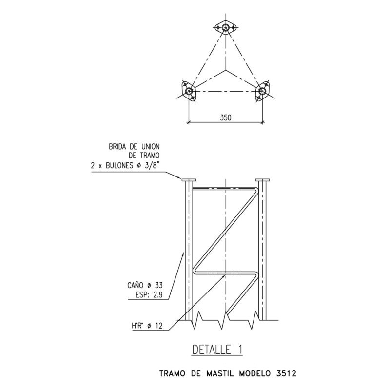 Estructura soldada con parante tubular de Ø 33 mm, reticulado en hierro de Ø 12 mm en configuración en ¨Z¨ lo que permite escalera en las 3 caras, de sección triangular, con un ancho de cara de 35 cm, provisto en tramos de 6 metros los cuales se vinculan mediante bridas para 2 bulones.