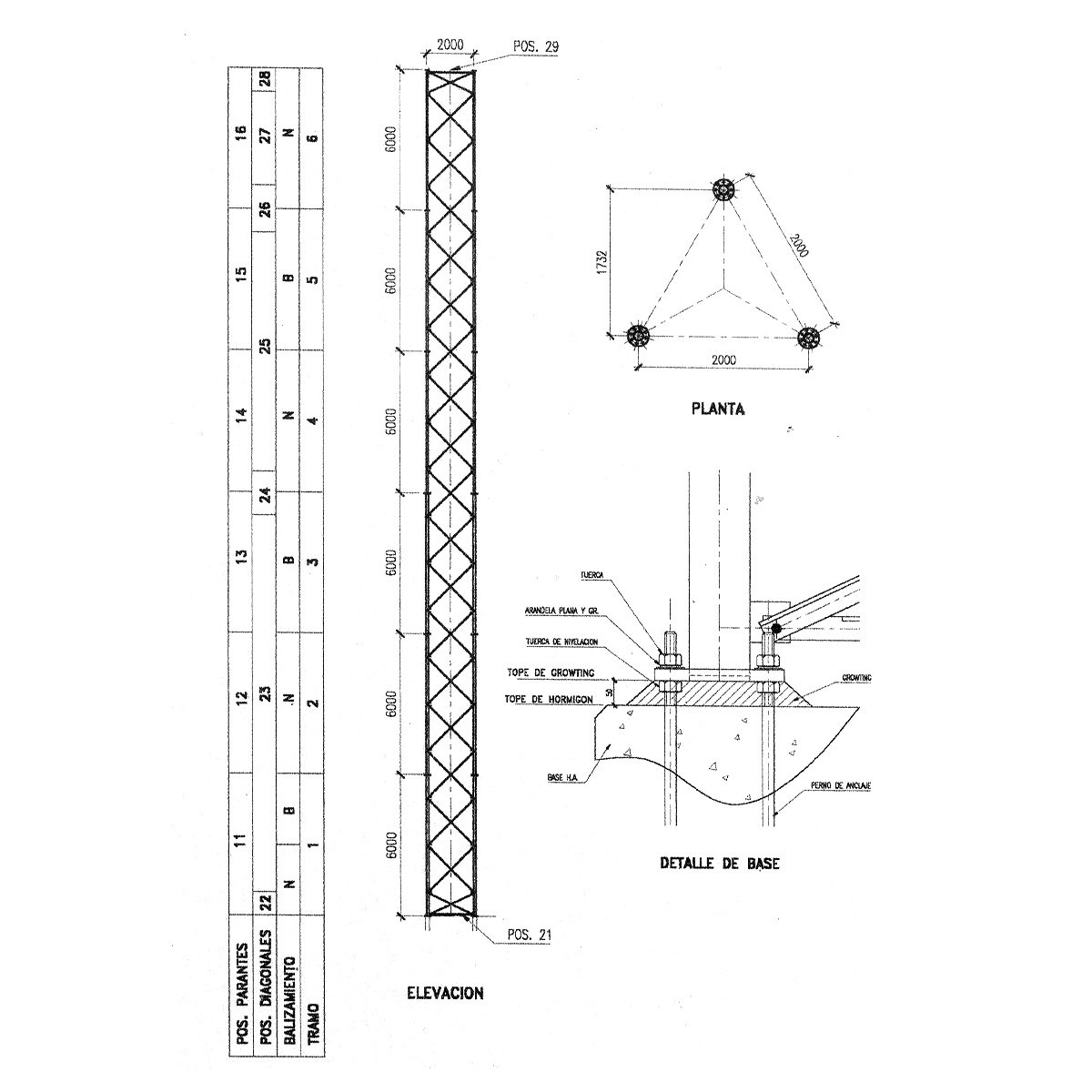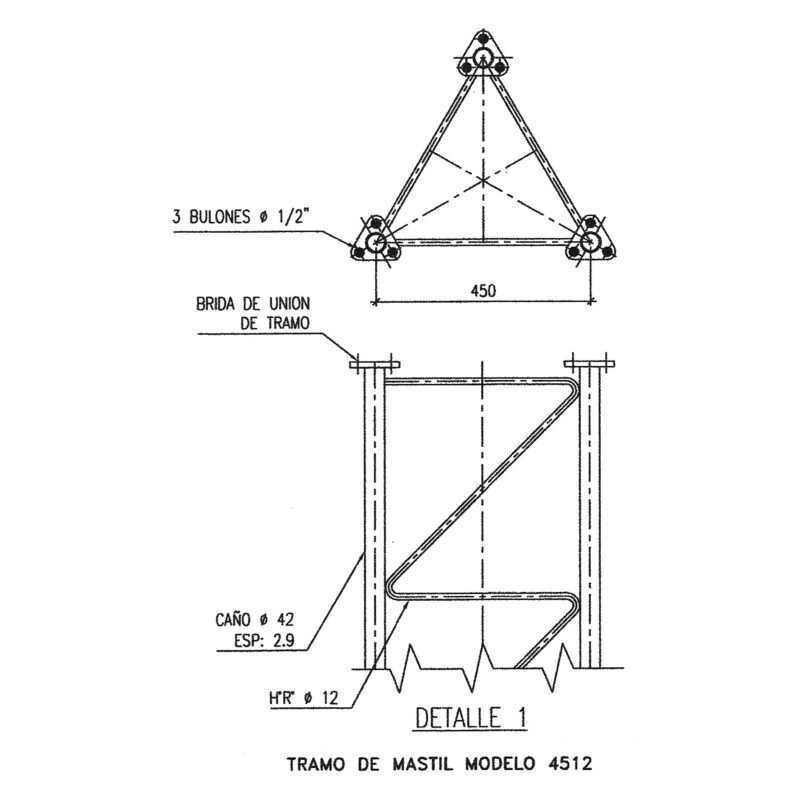 Estructura soldada con parante tubular de Ø 42 mm, reticulado en hierro de Ø 12 mm en configuración en ¨Z¨ lo que permite escalera en las 3 caras, de sección triangular, con un ancho de cara de 45 cm, provisto en tramos de 6 metros los cuales se vinculan mediante bridas para 3 bulones.