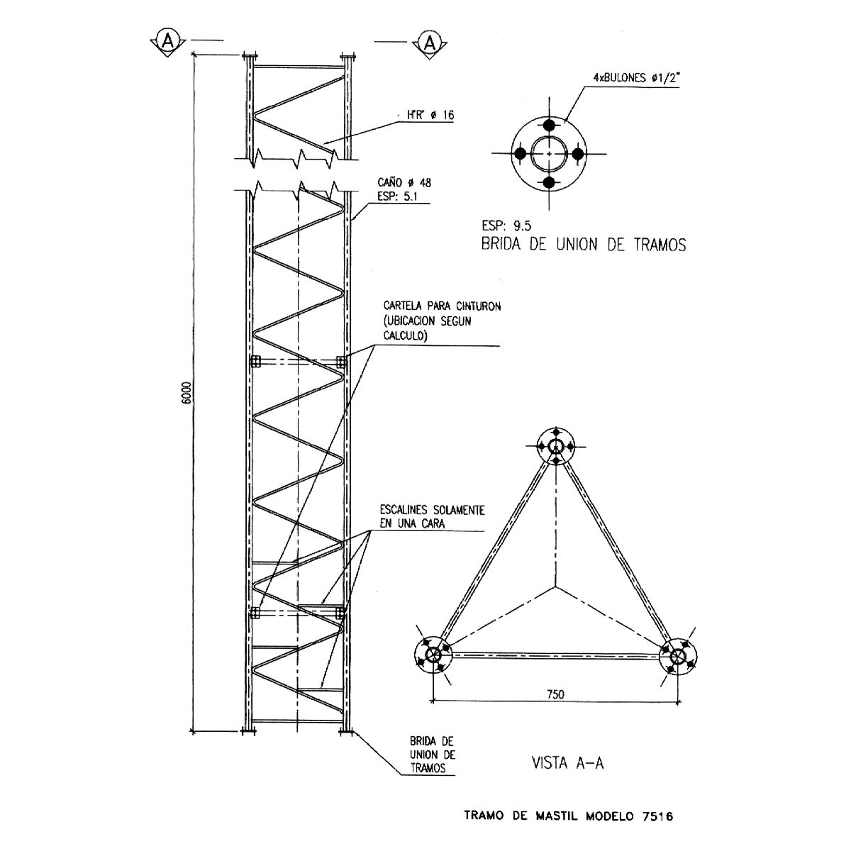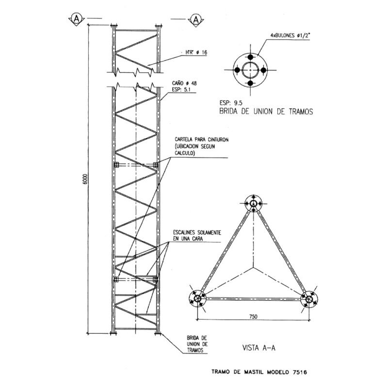 Estructura soldada con parante tubular de Ø 48 mm, reticulado en hierro de Ø 16 mm con escalines en una de sus caras, de sección triangular, con un ancho de cara de 75 cm, provisto en tramos de 6 metros los cuales se vinculan mediante bridas para 4 bulones.